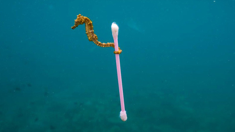 Fueron las palabras de Justin Hofman, fotógrafo que se encontró con el caballito de mar sujetando un cotonete y nombró la fotografía: Surfista de aguas residuales.