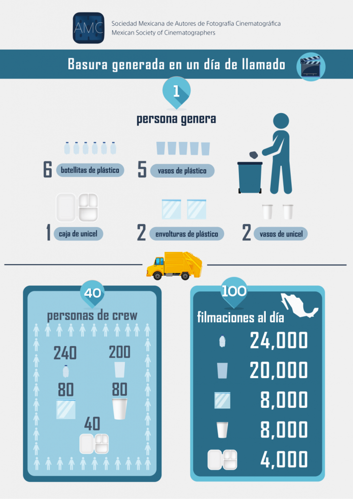 Con el ‘boom’ en series, comerciales y películas, hoy en día las casas de renta no se dan abasto y hay un promedio de 100 filmaciones al día en México lo que generará a diario:– 24 000 botellas de plástico– 20 000 vasos de plástico– 8 000 vasos de unicel– 8 000 envolturas de plástico– 4 000 cajas de unicel